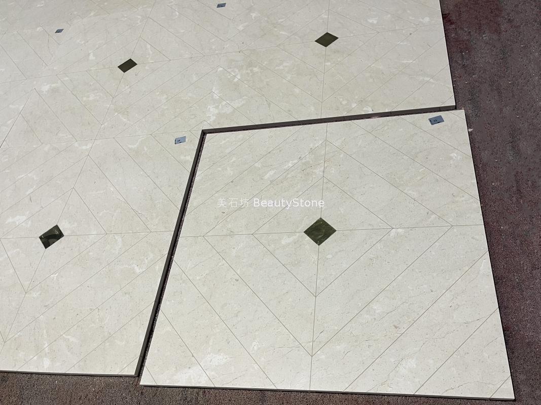 800*800mm Crema Marfil Tiles. Process 1.5mm wide pointing.Insert a small copper block in the middle.This is a very unique design,very creative.
